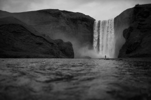 “You’ll come around the side of the mountain, and then turn left just after the waterfall.” These were the directions given by our hotel when late the night before travel I call to confirm our booking. “What if we don’t see the waterfall?” I asked, skeptically looking at the map – it was a little back from the road, we’d be arriving after dark… “You’ll see the waterfall,” replied the hotel receptionist after a moment’s ambiguous pause. We’d booked our Seattle trip through Icelandair, seeing a 25% saving compared to other airlines, offset by the minor inconvenience of a 2 hour stopover in Keflavik (which I viewed as a bonus, not having been to the country). Moment’s before booking I idly checked what happened to the price if you shifted that to a two day stopover – a near 40% saving… hence our two days in Iceland on the flight out, something I think I’ll repeat on all personal travel to the US. We dumped the idea of Reykjavik swiftly, opting to hire a car and make straight for Skógafoss – the vast south coast waterfall of which I have never seen a bad photograph. And it’s visible from the road, as a vast cube of roaring white power that dwarfs everything, everywhere, utterly. Not knowing where to start with my photographs of it, I picked this one for the view across the river. Sage advisors have noted different crops, which I do think are more effective, but I’m leading with this version for the wider sweep of foreground water. Amongst my top photography tips is that one should carry a pair of Crocs or Hunters (still waiting for the sponsorship cheque, if you’re reading this gents). In this case it was Crocs. The water is cold as a chemical burn, and earned me some enthusiastic heckles from Chinese onlookers – “牛! 牛! 牛!”. I like shooting just millimeters above the water, all a little haphazard, but really allowing the wide plane of rough water to dominate. Whilst I had it alone at night, a few fellow travelers were dotted around this frame – Photoshop is to thank for their not being visible here. I let one stranger remain, gazing up at the huge wall of falling water – probably still a good 150m+ from the falls themselves. For those who haven’t been; go. Hire a car at the airport and take the road east. It’s a couple of hours drive. Don’t worry about a map. You’ll see it from the road.