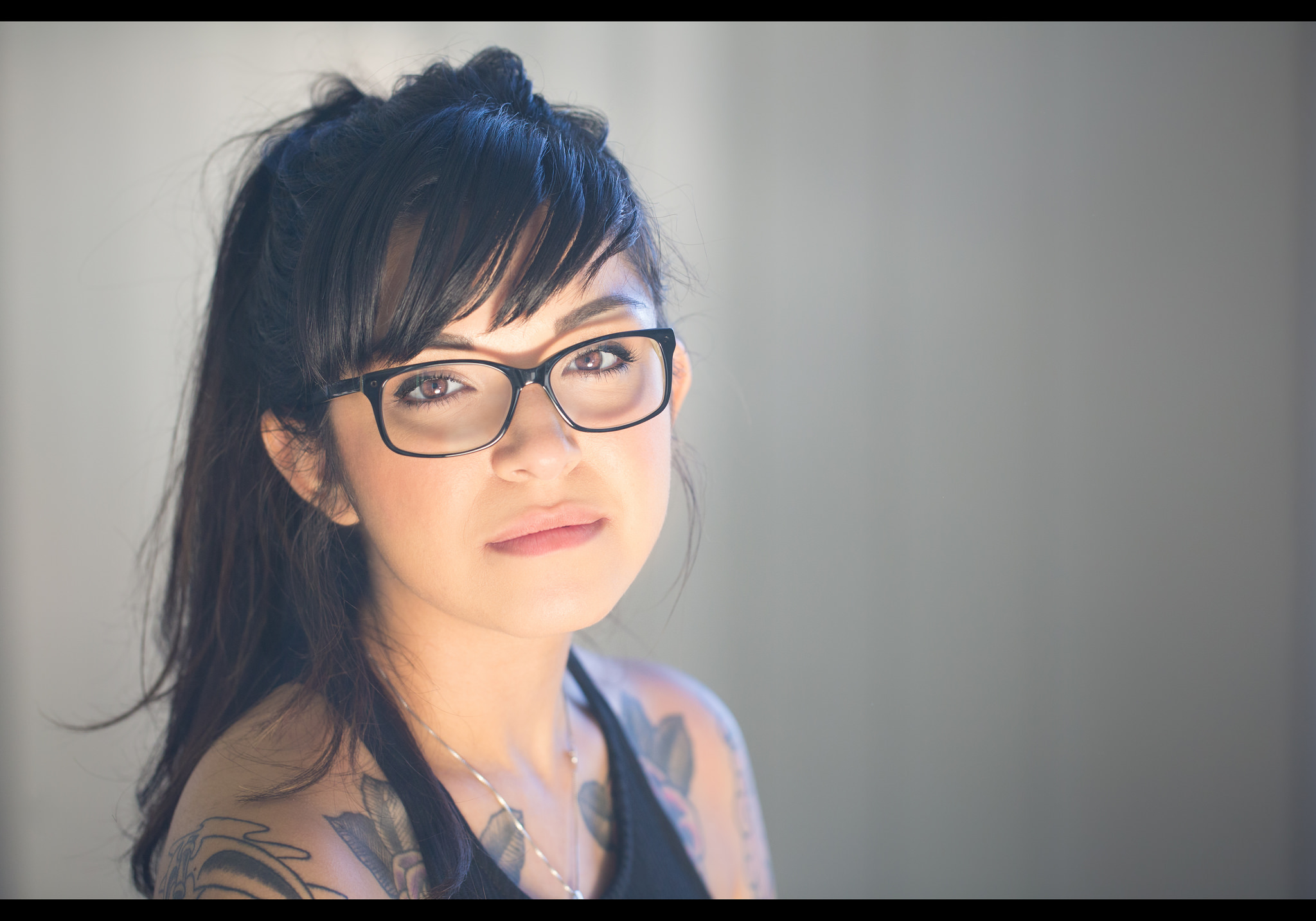 Having spent much of the summer in airports, I’ve looked at shooting in a number of them, but from the thousands of people waiting to fly, no one has really resonated with any of the backdrops I’ve seen. This encounter reminded me of a couple of things. Firstly, that with the right light, the requirements of a backdrop change instantly. Changing planes, with most of my kit on the runway somewhere, I only had a single reflector. When things looked a little flat using it in my typical way – Lily holding it just below shot – I took hold of it and fired the full strength sun back onto her. That was just a little too harsh and contrasty, but I found if I tilted the lens hood every so slighty into the sun (coming from a window over her shoulder to the right) then the resulting flare/haze helped control the contrast and rein it back in. With this appealing mix of light on Lily, I could adjust the exposure for the backdrop, and everything suddenly leapt into life.