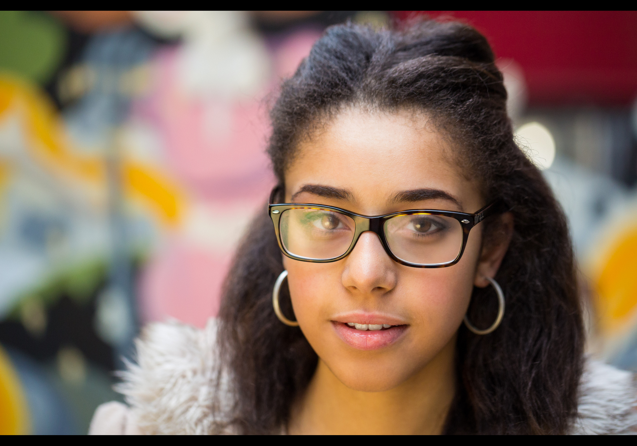 I saw her sitting on the pavement with a friend, and really liked the bold look and spectacles. I explained the 100 Strangers Project, and she was happy to join in. We walked twenty yards or so to get some street art for the backdrop, then fired off a few shots with xtarsy kindly assisting with a 110cm gold reflector.