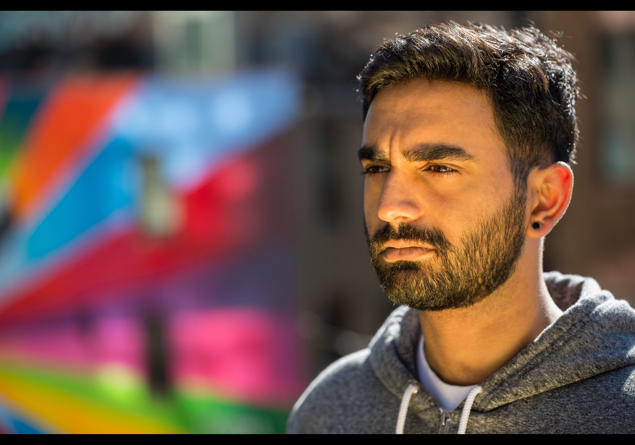 So embarrassingly I can’t tell you more than they had the feel of NYC locals, enjoying an intense intellectual discussion before I ambushed them. Prashant’s associate was incredibly game holding the gold reflector in harsh wind; the day we shot this was maybe -10C with the wind. That glow is light, not heat! Wanting to get the street art in the backdrop, and shooting from the narrow overlook, demanded a wrestle with a hard winter sun for backlight. The reflector is maybe a bit harsh bouncing that light back in. I figured we’d need to warmth of the gold side to give Prashant equal stage with the bright rainbow backdrop, yet perhaps a more diffuse white side would have given a more even tone.